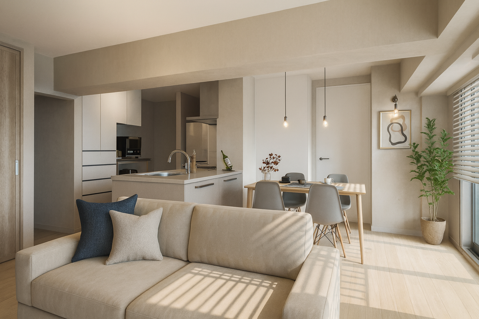 リビングやダイニングがどのように見えるかが分かる構図で作成しています。